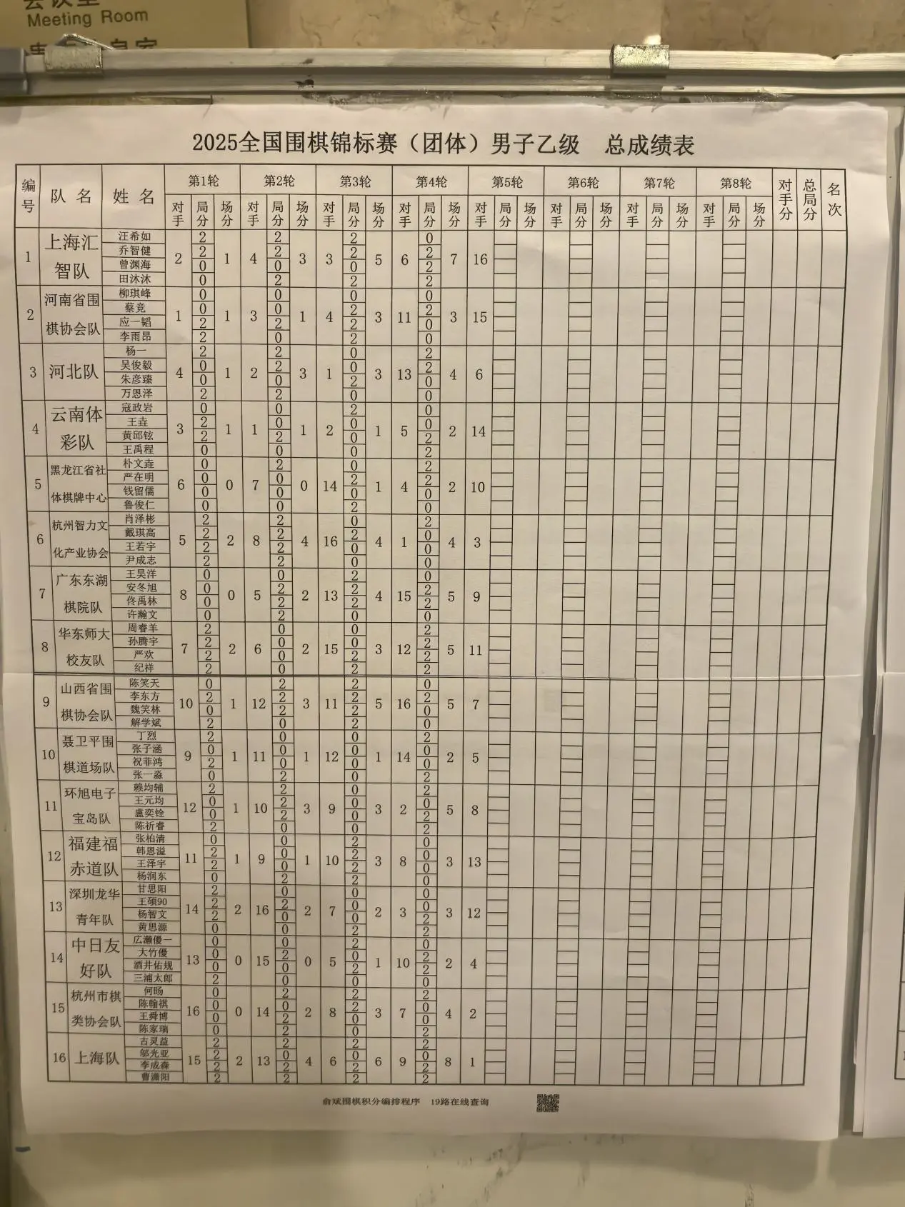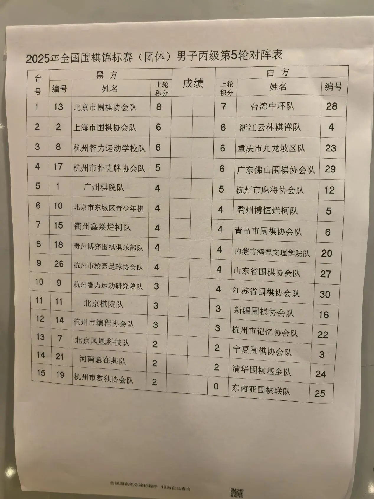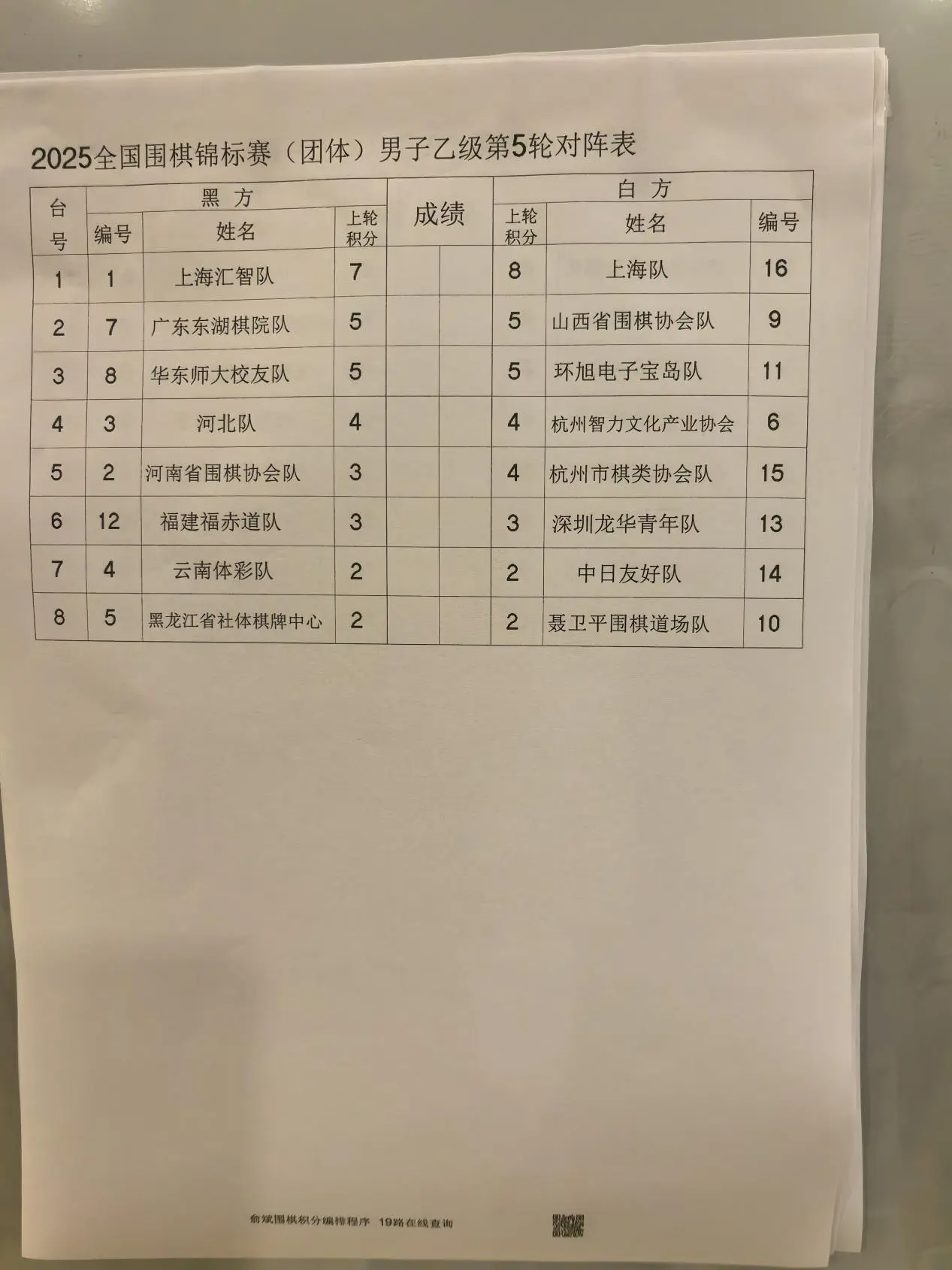 男子围乙,上海两支队领先优势明显,第5轮两队将展开对冲,此战将决定冲甲走势。