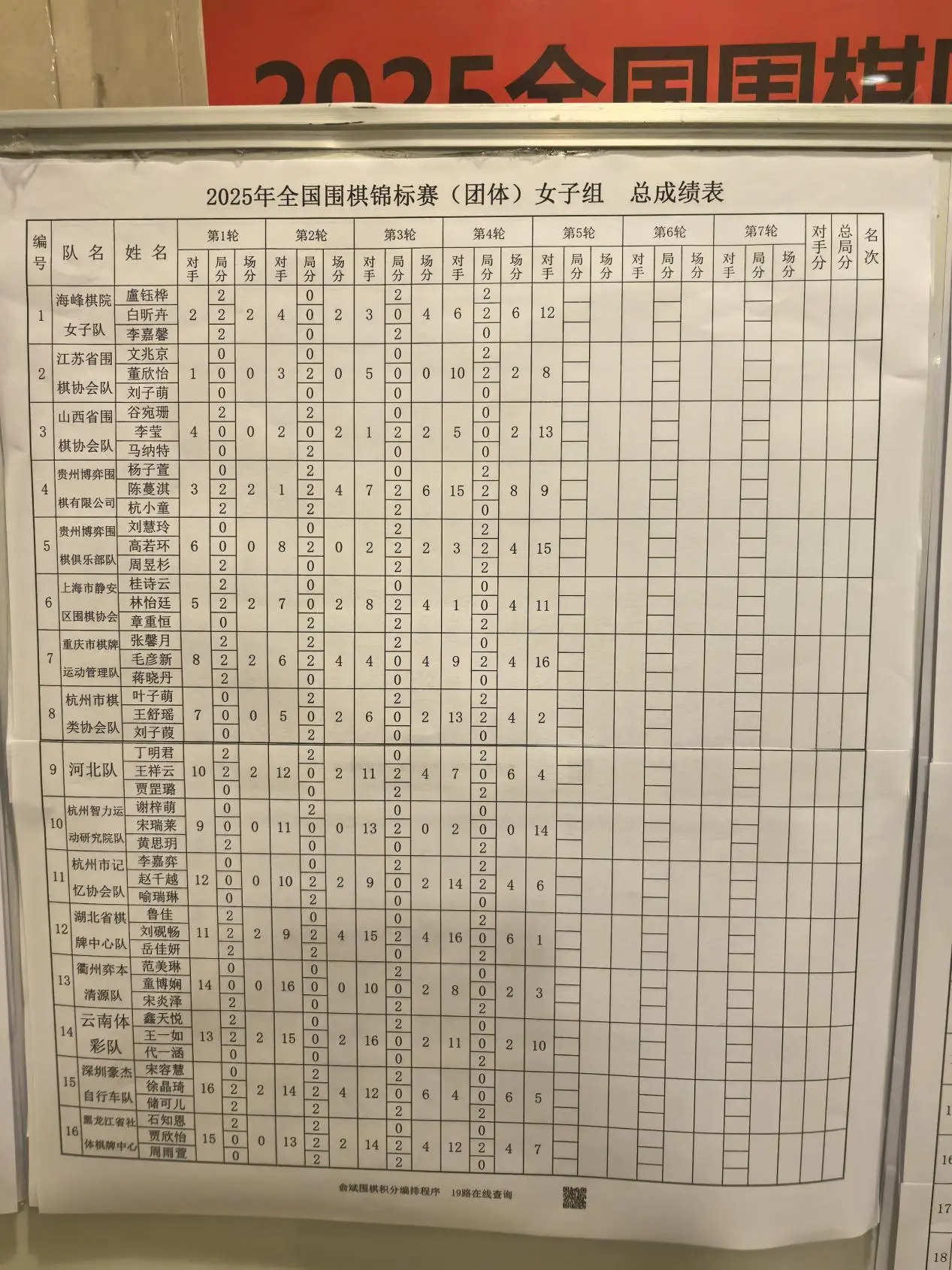 女子围乙,冲甲热门贵州博弈围棋有限公司队与深圳豪杰自行车队对冲,两队三盘棋拼得很猛,战至很晚才结束比赛。第一台杨子萱六段胜宋容慧五段,第二台陈蔓淇三段中盘胜徐晶琦四段,第三台杭小童四段不敌储可儿四段。此战过后,贵州博弈围棋有限公司队积8分一枝独秀,深圳豪杰自行车队、河北队、海峰棋院女子队、湖北省棋牌中心队等四队积6分紧随其后。